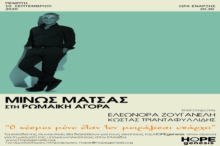 Συνεπής στην φιλοσοφία του και με ιδιαίτερη ευαισθησία, ο Μίνως Μάτσας συμμετέχει αφιλοκερδώς και στηρίζει την HOPEgenesis στο έργο της οποίας θα διατεθούν τα έσοδα της συναυλίας. Η HOPEgenesis είναι μία μη κερδοσκοπική οργάνωση που έχει ως αποστολή την καταπολέμηση της υπογεννητικότητας στη χώρα μας και διοργανώνει την συναυλία για την ενίσχυση του φιλανθρωπικού της έργου.