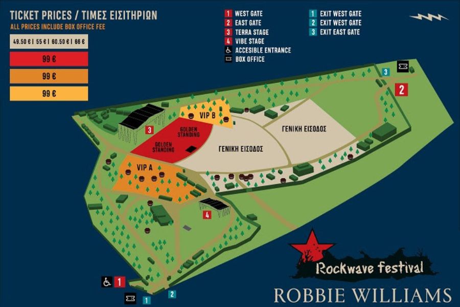 99 ευρώ – VIP (A & B) – 99 ευρώ – Με κάθε 3 VIP ή Golden Standing εισιτήρια παρέχεται 1 δωρεάν Θέση Στάθμευσης/Parking.