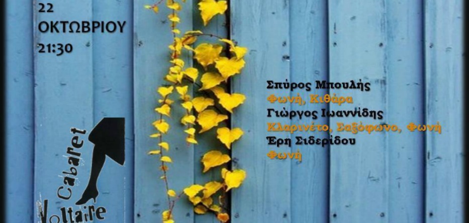 Με τους: Σπύρο Μπουλή (φωνή,κιθάρα), Γιώργο Ιωαννίδη (κλαρινέτο,σαξόφωνο), Έρη Σιδερίδου (φωνή).